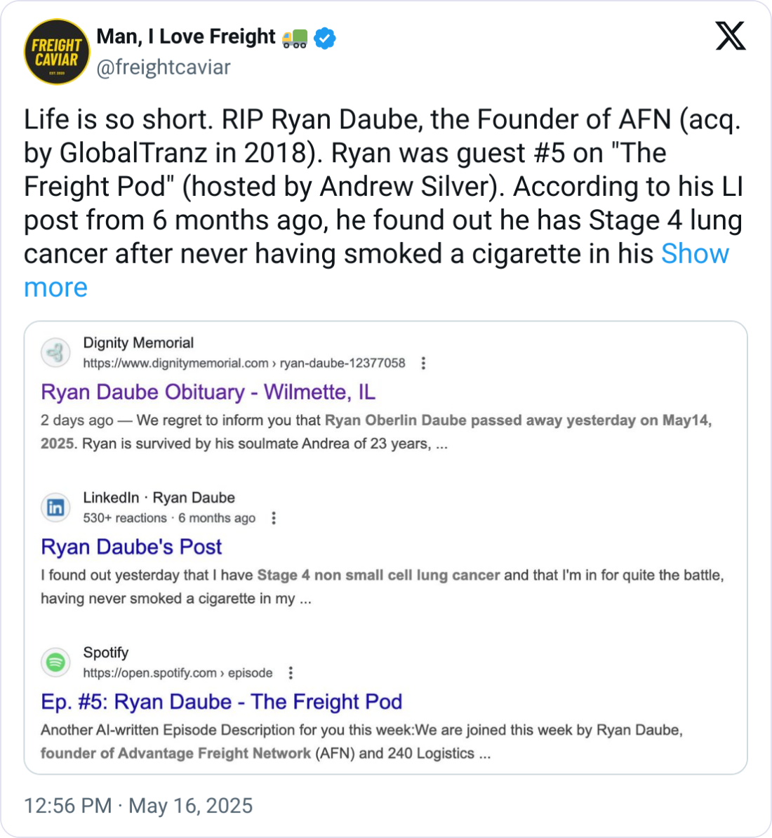 🕊️ Ryan Daube, Founder of AFN Logistics, Passes Away at 47. Ryan Daube, Founder of AFN Logistics, passed away on May 14 at age 47 after battling Stage 4 lung cancer. A respected leader in freight brokerage, Daube launched AFN in 2003, growing it into a top-tier 3PL known for its service culture and proprietary tech before its 2018 sale to GlobalTranz. He was also a guest on Episode #5 of Andrew Silver’s The Freight Pod, where he shared his insights and experiences in the industry. Remembered for his authenticity and team-first mindset, Daube wrote, “Throw at least five high fives for me today… nothing is guaranteed.” He is survived by his wife, Andrea, and four sons. A memorial will be held today in Deerfield, IL.