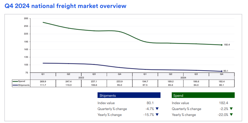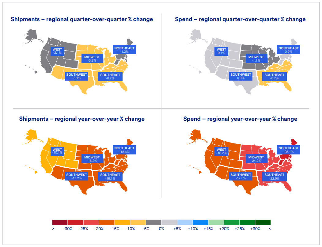 Yet, even though volumes fell, spend-per-shipment actually increased slightly, suggesting tighter capacity as trucking firms reduce fleet sizes.