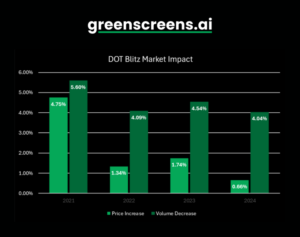 🚚 Road Inspection Impact. Greenscreens.ai data shows DOT Blitz has a minor impact on prices, averaging a 1-2% increase, partially offset by a 4-5% volume dip. The effect, mostly on long hauls, varies yearly but isn't tied to market conditions.