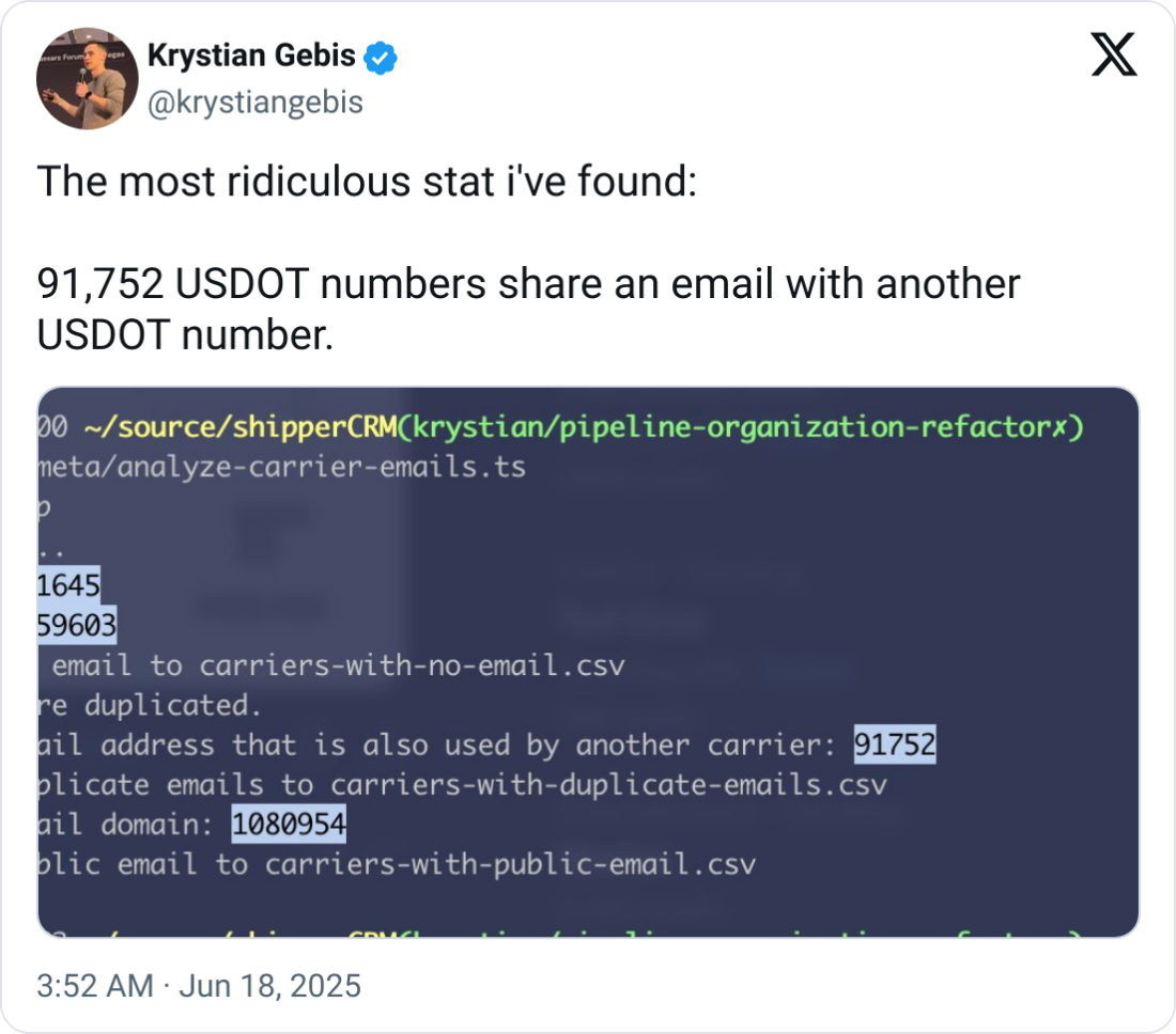 🎯 Shared Emails Everywhere. Over 91,000 USDOT numbers share the same email. It’s a messy mix of duplicate setups, shady brokers, and old service bureau defaults.
