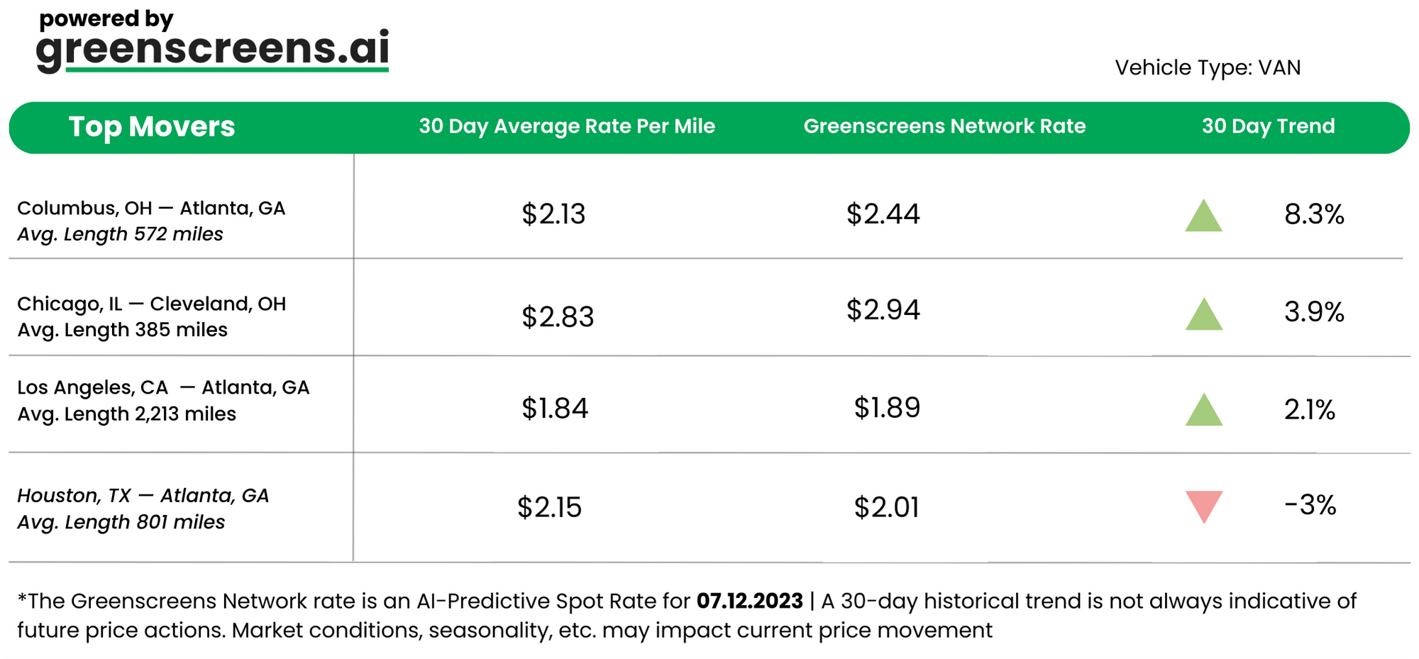 *Greenscreens.ai, forecasts real-time truckload buy prices that are suited to each freight brokerage's purchasing power using AI and machine learning. Its engine takes into account over 130 attributes and data points in each rate forecast.