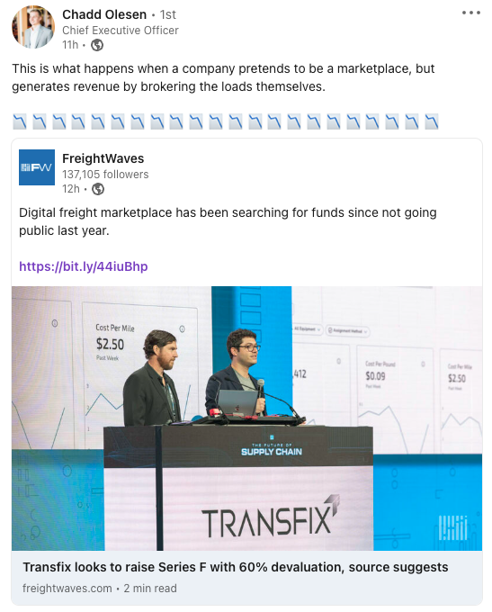 📉 Transfix's Valuation Plummets. Transfix seeks $50M in fresh funding at a 60% lower valuation, as Chadd Olesen criticizes the company for acting like a marketplace but brokering loads themselves.