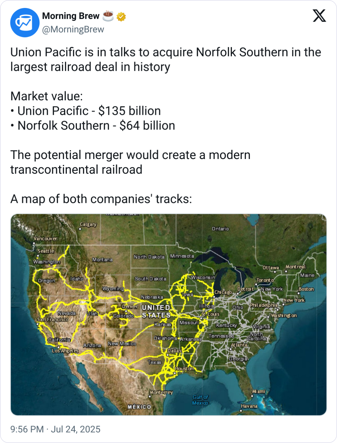 If Union Pacific and Norfolk Southern merge (a $200+ billion deal currently in advanced talks), it would create the first coast-to-coast Class I railroad in U.S. history.