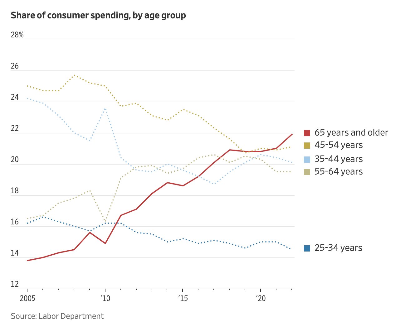 👴 Seniors' Big Spending. As the Federal Reserve raises interest rates, the resilience of consumer spending is attributed to the growing elderly population. In August, a record 17.7% of the population was 65 or older, with strong finances and reduced borrowing needs. Seniors accounted for 22% of spending in 2022, up from 15% in 2010. Their spending reflects health, wealth, and post-pandemic attitudes. Older Americans are spending more on recreation, travel, and experiences. The baby boomer cohort's retirement years contribute to this trend, bolstered by their substantial wealth and Social Security adjustments. Seniors' robust spending is a key factor in economic stability.