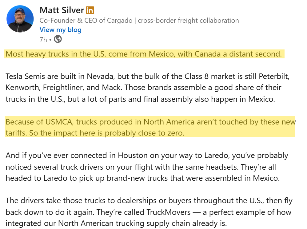 At the same time, Scott Oliphant, a Louisiana truck dealer, points out that under section 232, Mexico and Canada are still included, so U.S. fleets would feel the pinch.
