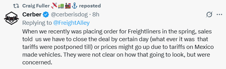 Confusion: One fleet operator shared that when ordering Freightliners earlier this year, sales reps warned they had to sign quickly before tariffs hit Mexico-made trucks, but couldn’t explain exactly how the rules would work.