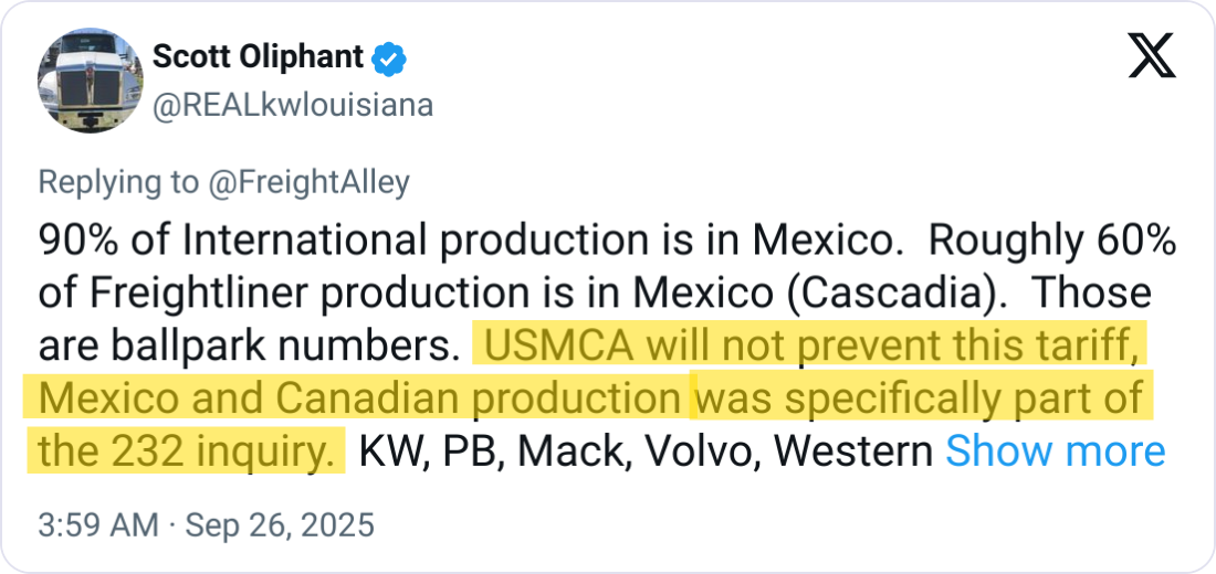 A 25% tariff only adds uncertainty. Some carriers are reportedly rushing orders before October 1. Others are preparing to sweat their aging tractors a few more years, which raises maintenance costs and puts more risk on the road.