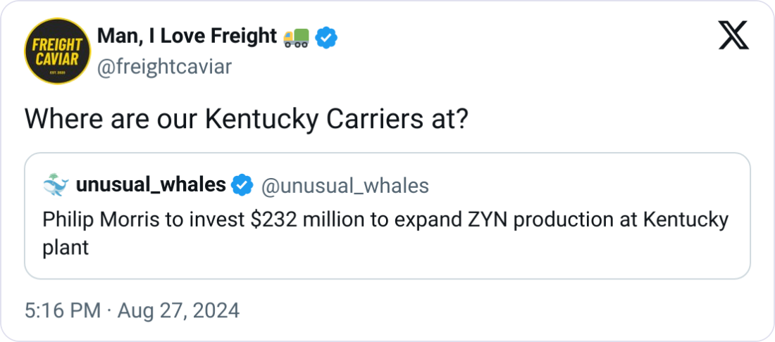 🚬 Philip Morris Invests $232M in Kentucky for ZYN Expansion. Philip Morris International (PMI) is expanding its Kentucky factory with a $232 million investment to increase production of ZYN nicotine pouches, creating 450 new jobs. The expansion, set for completion by mid-2025, aligns with PMI's strategy to shift from traditional cigarettes to smoke-free alternatives. While ZYN offers a tobacco-free nicotine option, the long-term health effects remain uncertain. The move could provide new opportunities within the freight industry in the Kentucky area and abroad if new lanes are opened within this “smoke-free” industry. PMI also has Colorado on its horizon, hoping to soon open shop in Aurora.