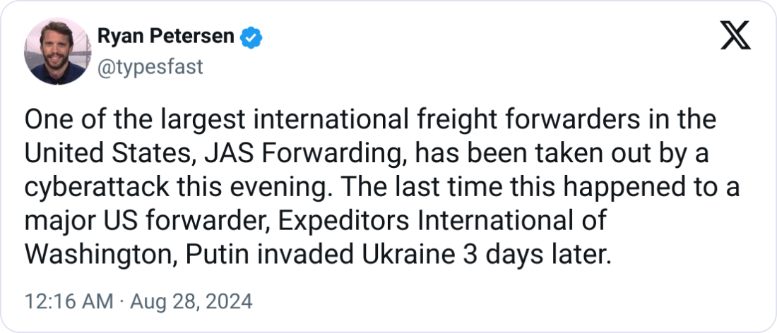 Happy Wednesday. Today's feature highlights a 49% surge in U.S. cargo thefts in early 2024, new developments at Zyn's Kentucky plant, JAS Worldwide's ransomware attack disrupting operations, and the Port of NY-NJ hitting record container volumes.