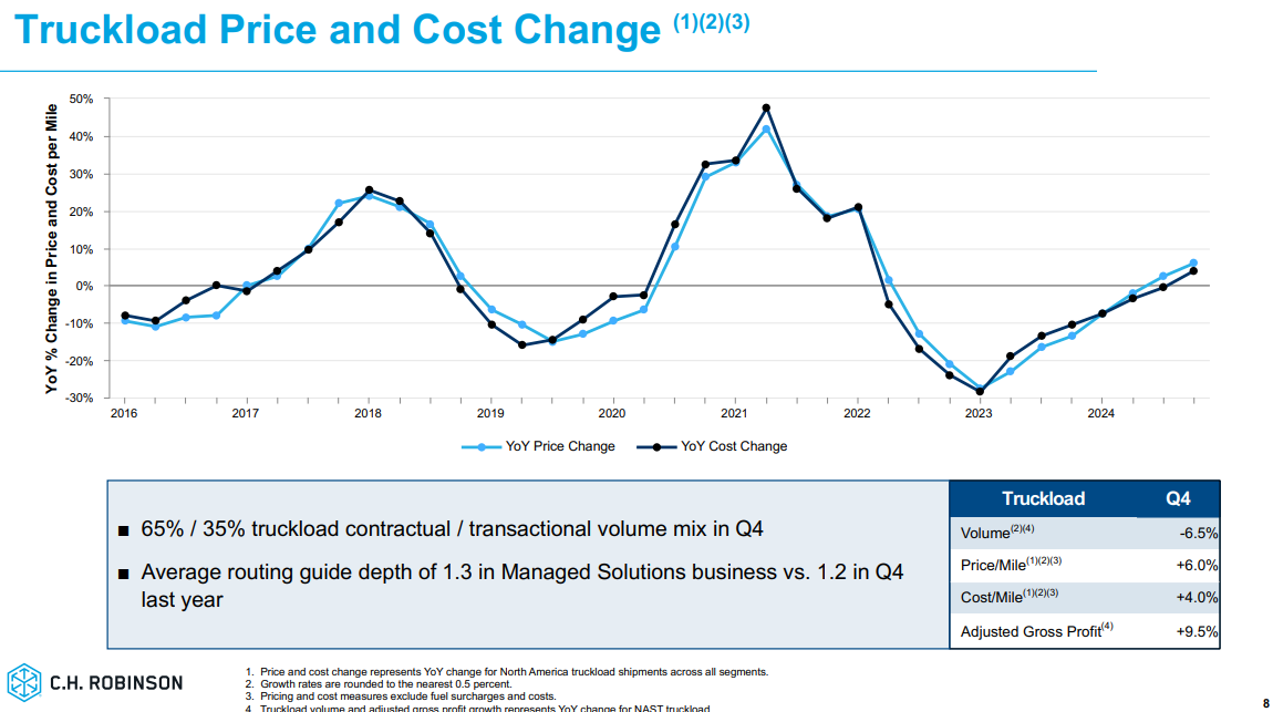 Truckload Pricing Rebounds, But Volume Drops C.H. Robinson’s Q4 truckload rates rose 6% YoY, while costs increased 4%. Volumes dropped 6.5%, but a 9.5% profit boost came from better price-cost spreads. Image Source: C.H. Robinson Q4 Earnings Deck