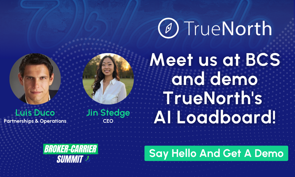 Headed to the Broker-Carrier Summit? Come say hi to Jin Stedge and Luis Duco from TrueNorth! We’ll be showing off our AI Loadboard, which we built to make broker-carrier matching faster, smarter, and easier. Stop by, chat with us, and see how TrueNorth’s tech can help you cover more loads and save more time.