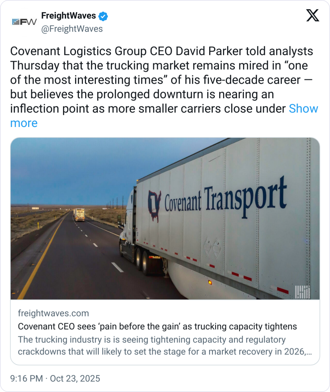 đźšš Covenant Sees Growth. Covenant Logistics boosted Q3 revenue 3.1% to $296.9M as demand stayed muted. CEO David Parker said asset-light growth and cost control remain key amid overcapacity.