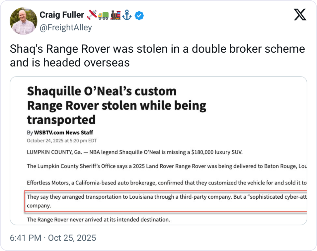 🚗 Shaq’s $180K Range Rover Vanishes. Authorities are investigating the theft of Shaquille O’Neal’s custom 2025 Range Rover, valued at $180,000, after it disappeared while being shipped from Georgia to Louisiana. Investigators believe someone posed as a transporter to steal the SUV. The vehicle, modified for O’Neal’s 7-foot-1 frame by Effortless Motors, never arrived at its destination, and GPS data suggests it may already be inside a shipping container overseas. The driver listed for the delivery was never dispatched, according to FirstLine Trucking LLC. Effortless Motors is offering a $10,000 reward while authorities pursue suspects linked to an Atlanta location.
