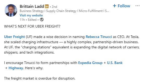 Supply chain strategist Brittain Ladd detailed how new CEO Rebecca Tinucci could transform Uber Freight into North America’s most advanced freight marketplace. Drawing parallels to her work scaling Tesla’s charging infrastructure, Ladd outlined a vision in which Tinucci partnered with Expedia Group, U.S. Bank, and Highway to integrate instant booking, payment, and fraud prevention into one seamless transaction.