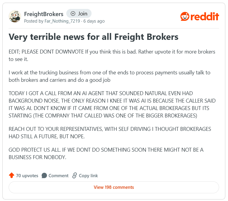 Over on r/FreightBrokers, A post this week captured a moment that felt like a warning shot: a user working in freight payments received a call from an AI voice agent representing a major brokerage. It sounded natural, even had background noise. The only reason the caller knew it wasn’t human? The AI said so.