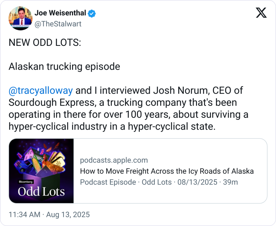 In the latest Odd Lots episode, Joe Weisenthal and Tracy Alloway interview Josh Norum, CEO of Sourdough Express, a century-old Alaskan trucking company. The conversation explores how the carrier navigates the state’s uniquely volatile freight market, shaped by both oil-driven boom-and-bust cycles and the trucking industry’s own cyclical nature. Topics in the podcast include Sourdough’s history, operational challenges in extreme conditions, the effects of tariffs, and the opportunities that come with serving America’s northernmost supply chain. You can listen to the podcast here.
