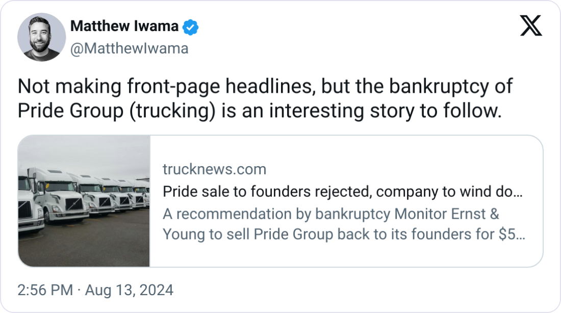 Good morning. Pride Group shuts down under massive debt, while Mexico solidifies its position as the U.S.'s top trading partner, and a trucking owner pleads guilty in a fatal crash case. Plus, we take a look at the fastest-growing logistics companies on the Inc. 5000 list.