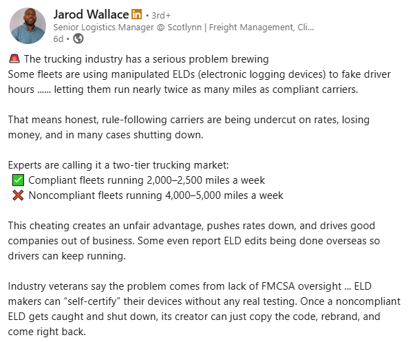 Jarod Wallace, Senior Logistics Manager at Scotlynn, offered his thoughts to what he calls a growing split in trucking: compliant fleets running legally tight schedules versus carriers using manipulated ELDs to log nearly double the miles.