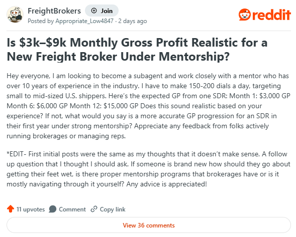 A post on r/FreightBrokers this week questioned whether a new subagent could realistically generate $3K–$9K in monthly gross profit within their first year under mentorship.