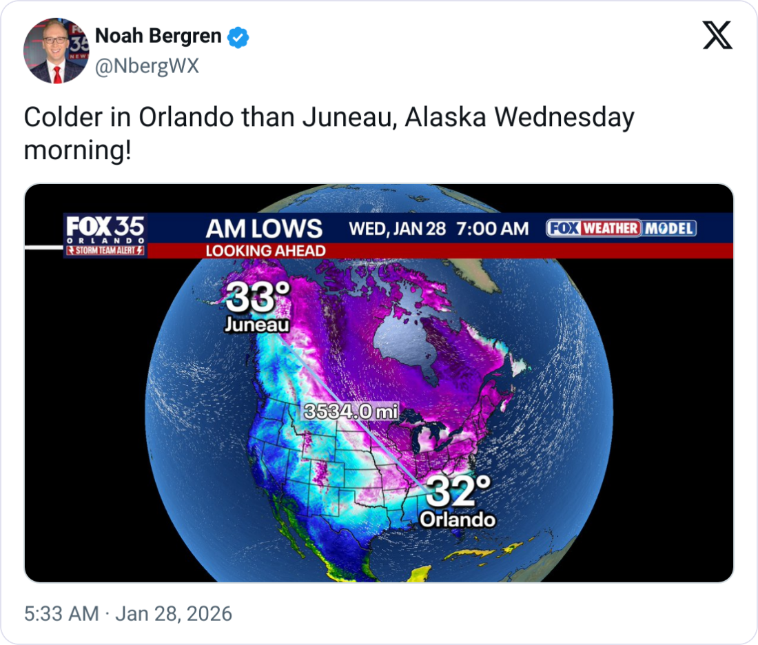 🥶 Arctic Cold. Wednesday morning temperatures in Orlando fell below Juneau...crazy. Another Artic blast is forecast for this weekend with the Southeast slated to experience record-breaking low temperatures.