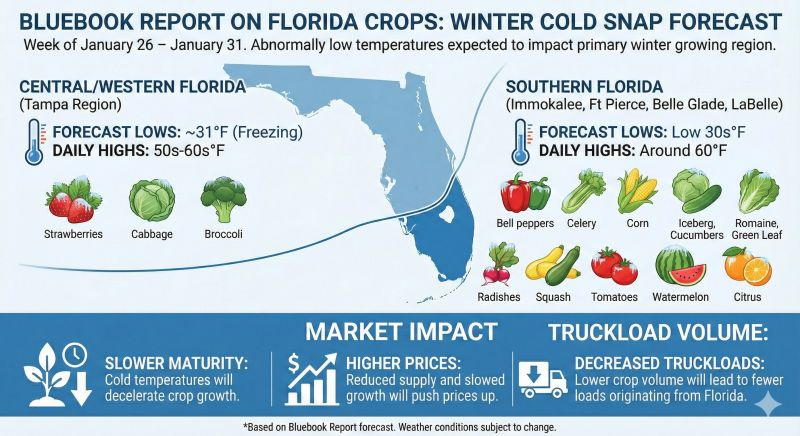 🥶 Florida Produce Tightens. DAT Principal Analyst Dean Croke said Florida’s cold snap will slow crop maturity, reducing produce volumes just as Valentine’s Day flower shipments surge, thus tightening reefer capacity out of the state.