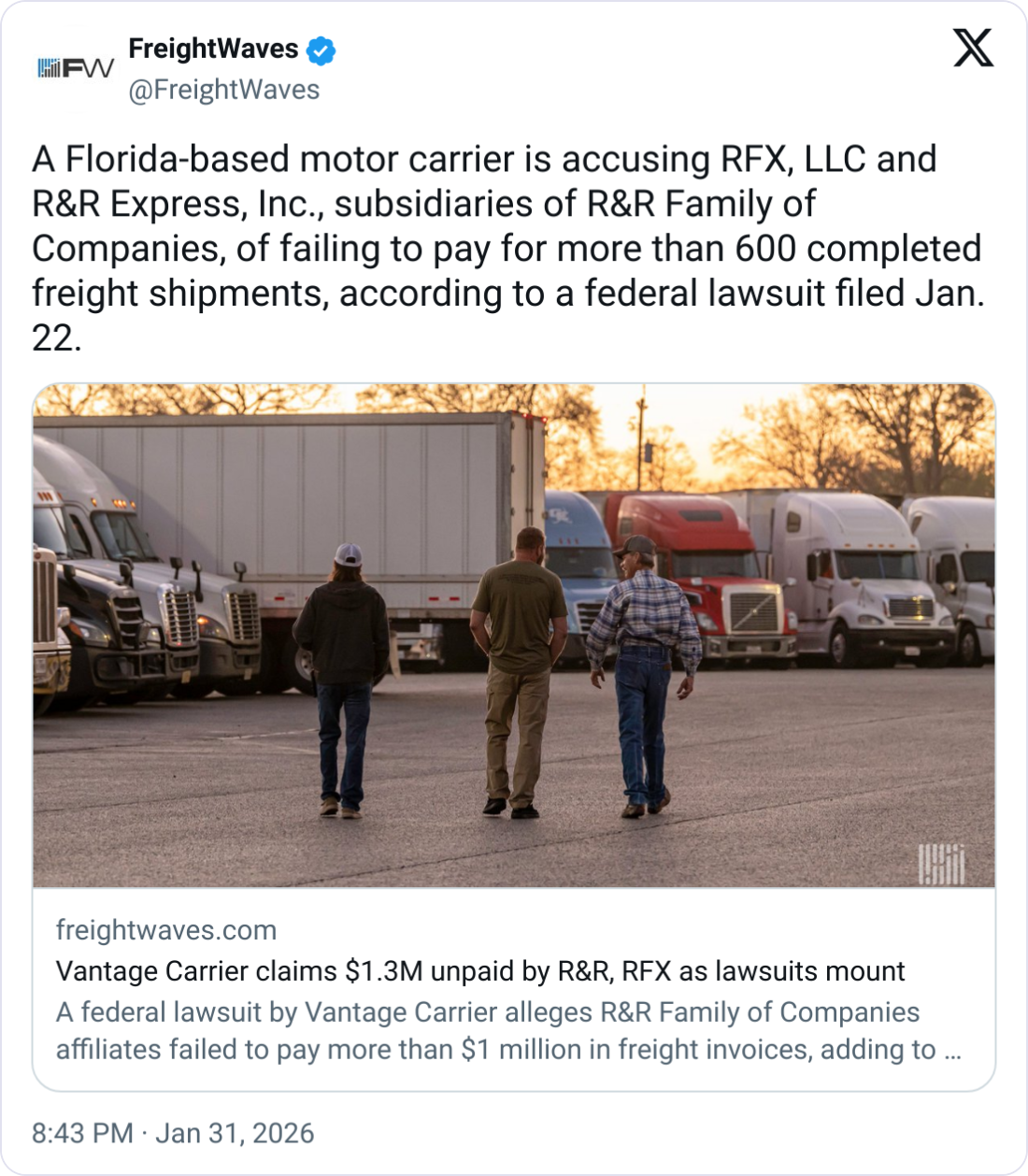 Happy Monday. Unpaid freight claims tied to R&R are spreading through the industry. New lawsuits are adding clarity to the financial damage left behind.