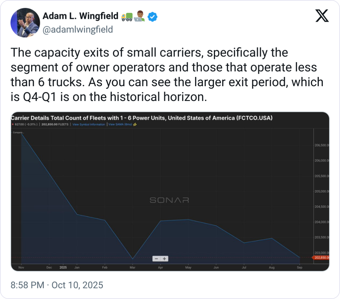 What’s happening: small and marginal carriers are bleeding out. In a market where spot might be firming, fewer players mean less buffer.