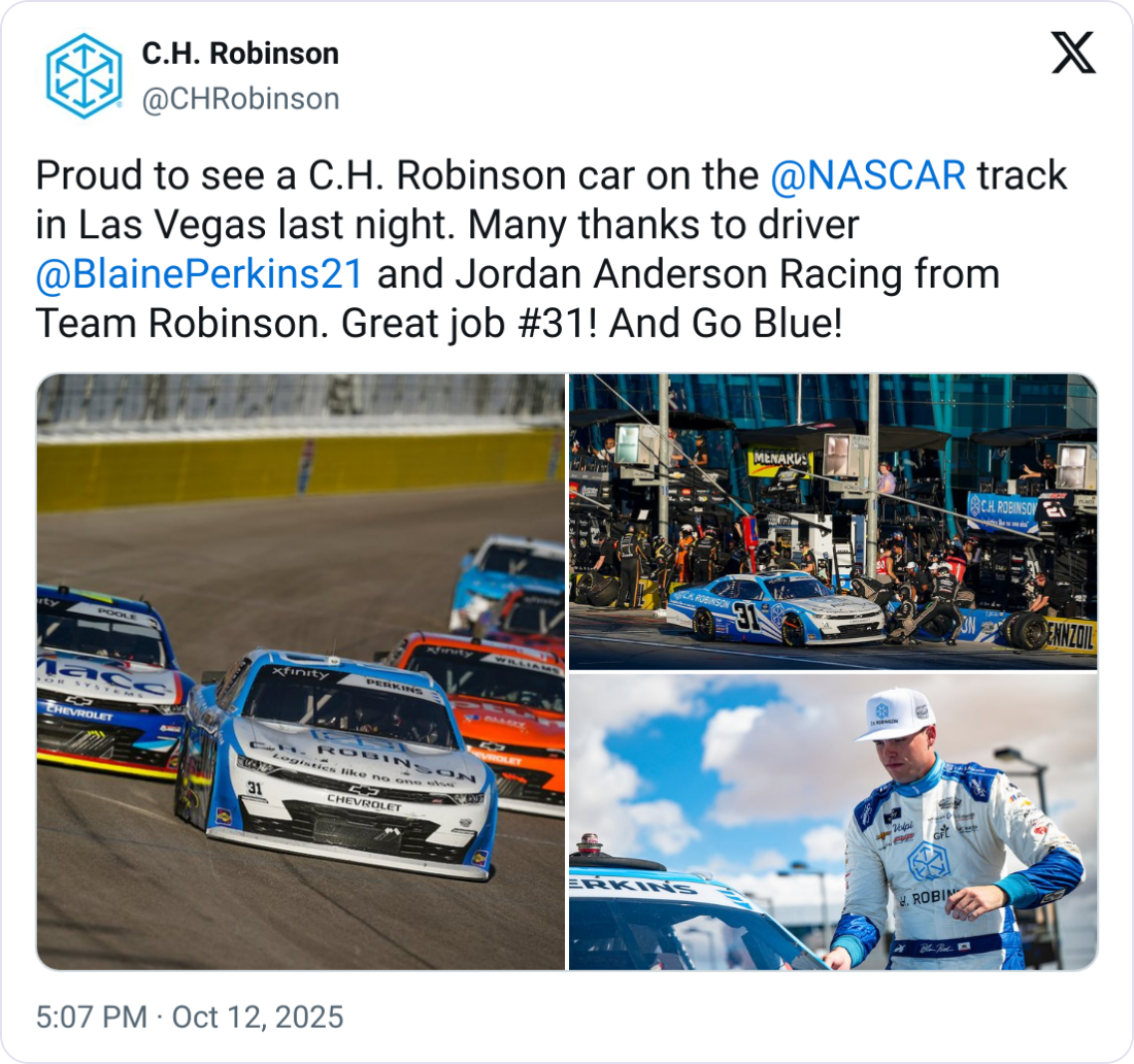 🏁 C.H. Robinson NASCAR Debut. A C.H. Robinson–branded car hit the NASCAR track in Las Vegas, marking the brokerage’s latest brand partnership. The driver, Blane Perkins, placed 27 in the race on Saturday night.