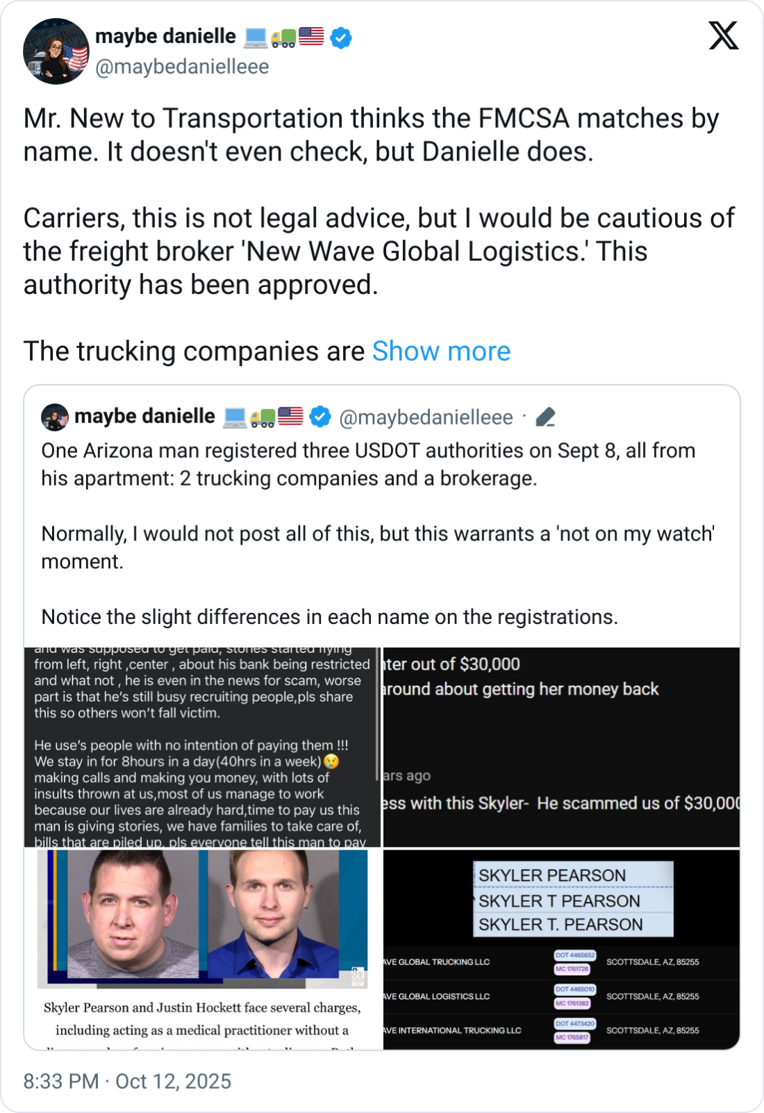🚨 Danielle Chaffin Flags Arizona “New Wave” Freight Setup. Industry researcher Danielle Chaffin shared a post on X cautioning carriers to “be cautious of the freight broker ‘New Wave Global Logistics.’” According to Chaffin’s review of FMCSA data, an Arizona resident, Skyler Pearson, registered three new USDOT authorities on September 8: two trucking companies and a brokerage, all linked to the same residential address. The entities include New Wave Global Logistics, New Wave Global Trucking LLC, and New Wave International Trucking LLC, each listing one truck. Chaffin also noted that court records from 2022 show Pearson faced criminal charges in Las Vegas related to an unrelated medical spa business.