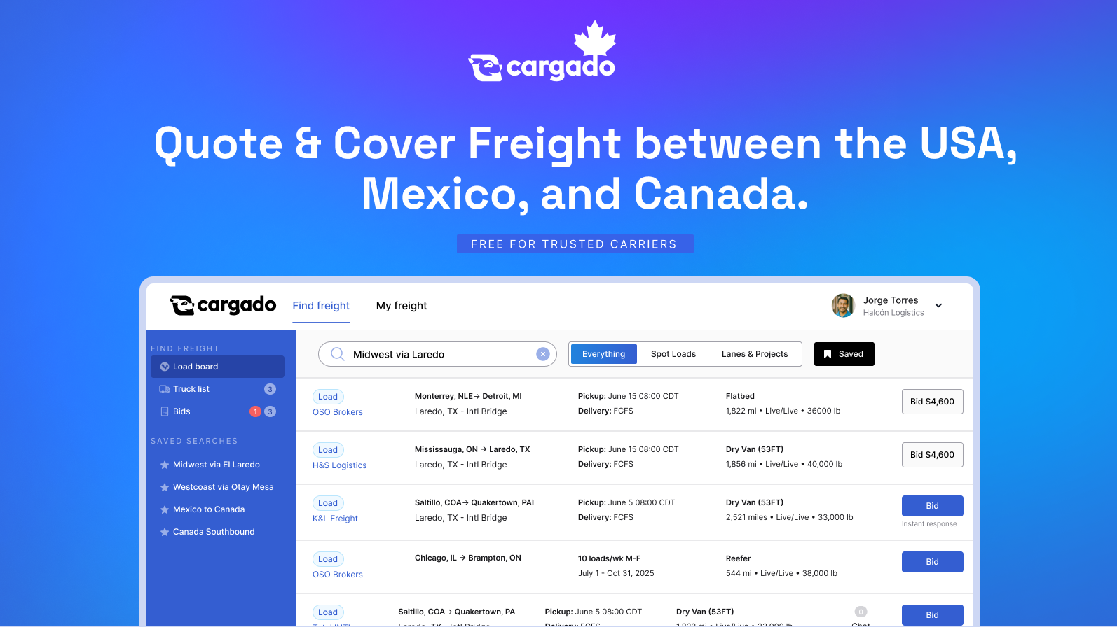 Grow your cross-border business with Cargado. Free for carriers and now available in Canada.