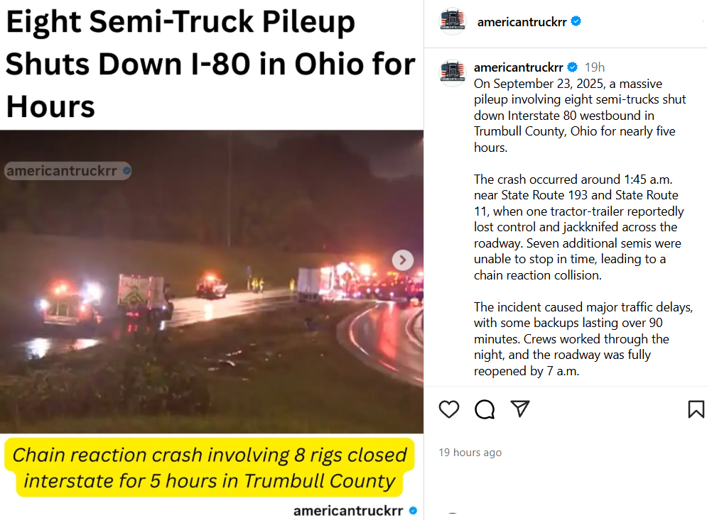 💥 Eight-Truck Pileup. A chain-reaction crash on I-80 in Ohio began when one semi jackknifed across the roadway. Seven others were unable to stop, colliding with the rig. The pileup closed the highway for five hours. No fatalities were reported.