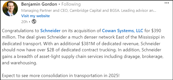 Gordon also discussed the broader shift toward strategic acquisitions, particularly in asset-heavy and asset-light segments. Deals like this expand geographic reach and service offerings and also create synergies in areas like dedicated transportation, drayage, and brokerage services.