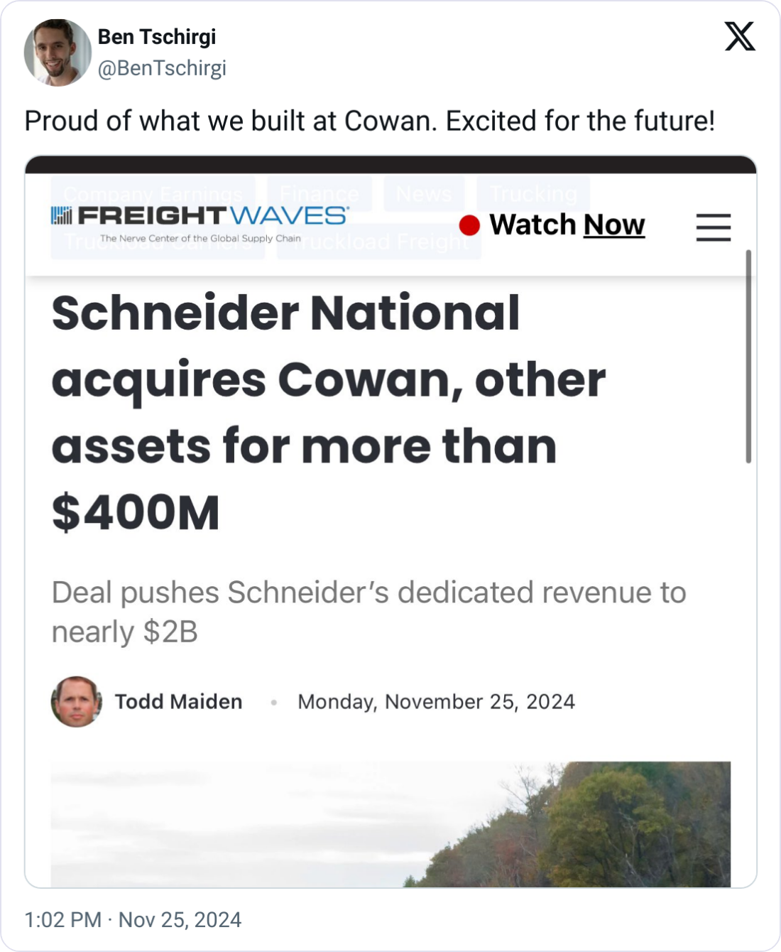 Good Tuesday morning. Schneider National, a staple in the transportation industry since 1935, just announced a pretty big acquisition: Baltimore-based Cowan Systems, LLC.