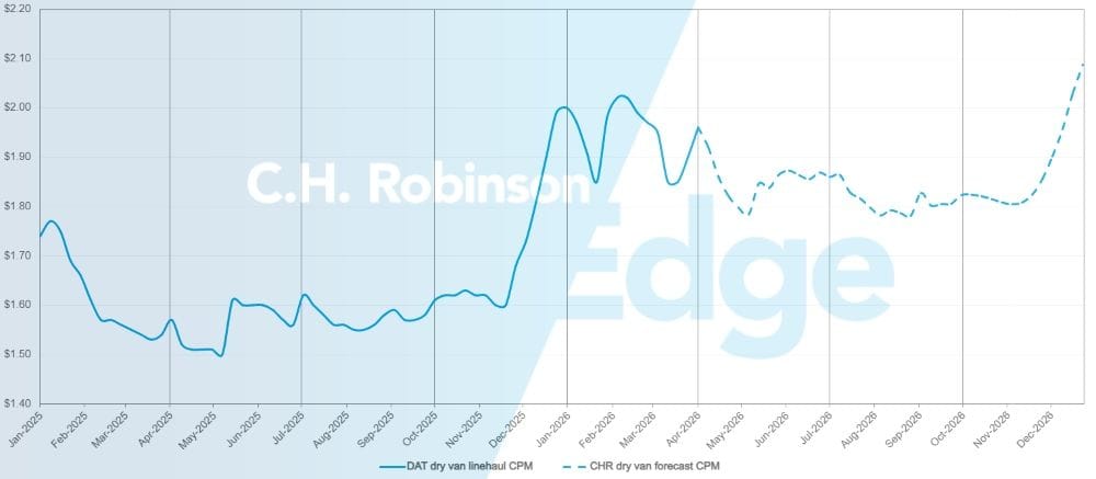 📈 C.H. Robinson Forecast Rising Rates. C.H. Robinson's Director of Market Intelligence, Ryan Hammett, tagged us directly to share their April forecast update: dry van costs are now projected to rise 17% year-over-year, with reefer up 16% y/y. The chart tells the story — rates bottomed out through most of 2025, surged sharply in early 2026, and the C.H. Robinson forecast shows no reversal through end of year.