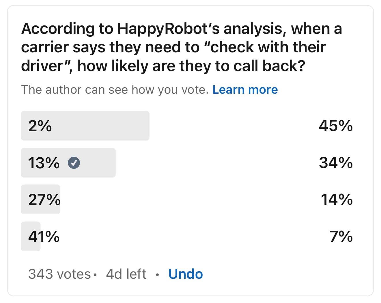 When a carrier says, “Let me check with the driver,” they only call back 13% of the time, according to HappyRobot data. Interestingly, most respondents in our LinkedIn poll estimated the callback rate to be just 2%.