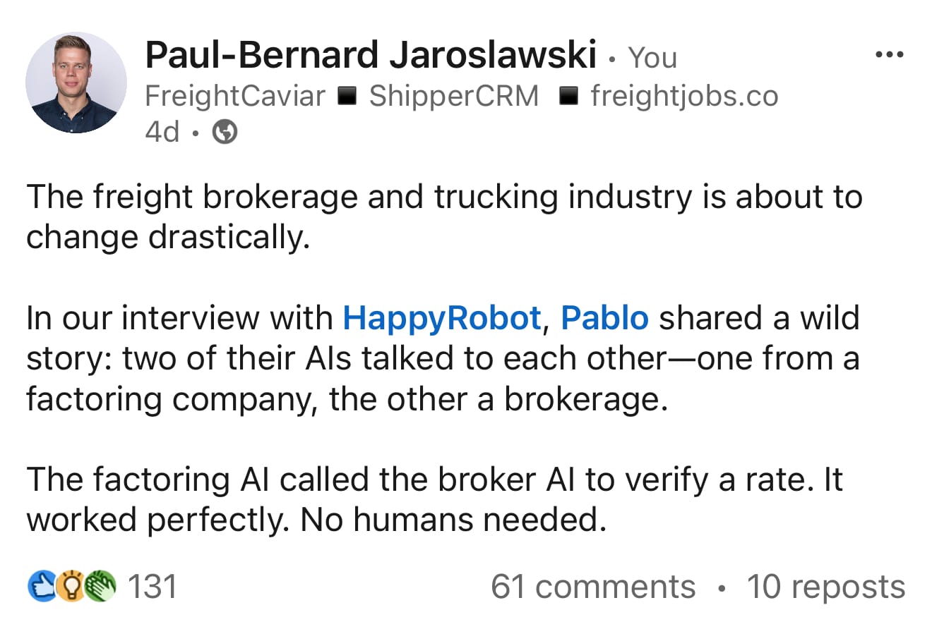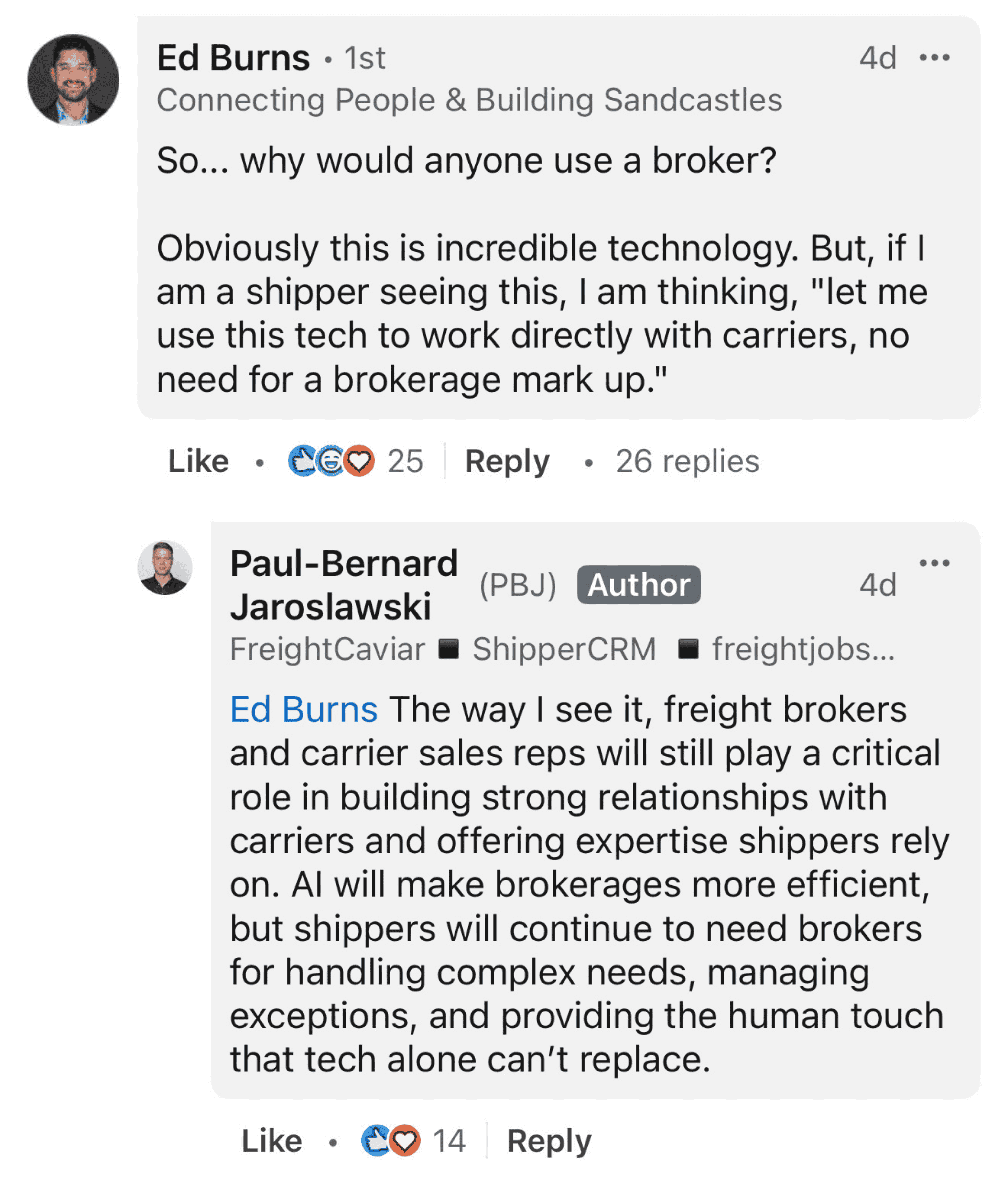 The comments highlighted below came from Paul’s recent LinkedIn post, where the freight industry shared their thoughts on AI’s role in brokerage.
