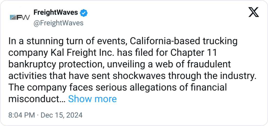 📄 Kal Freight’s Bankruptcy Unveils Massive Fraud Scandal. Kal Freight Inc., a California-based trucking firm employing 600 drivers, filed for Chapter 11 bankruptcy, revealing staggering allegations of fraud and asset mismanagement. Daimler Truck Financial Services claims Kal Freight fabricated titles for non-existent trailers, securing $16.8 million, and illegally transferred collateral worth $20 million to affiliates in Canada. Further, trucks and trailers were sold or leased under dubious transactions, risking $40+ million in creditor losses. To salvage operations, Kal Freight ousted its founder and appointed independent directors alongside a chief restructuring officer. Creditors and industry insiders now await resolution of this tangled web of deception and debt.