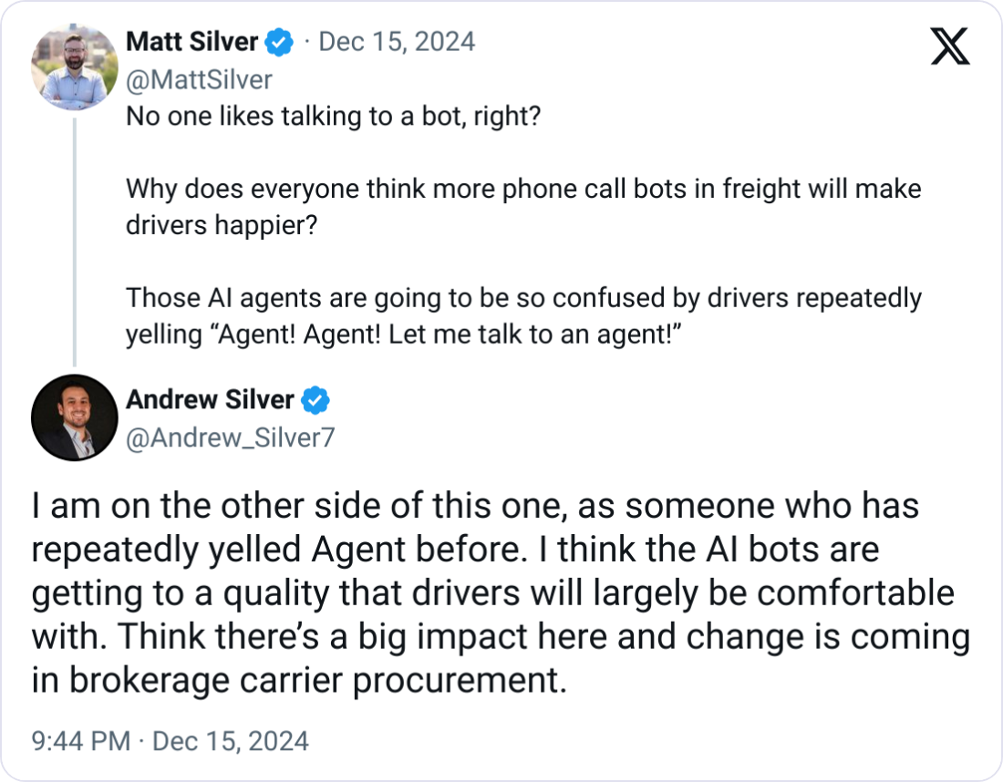 Instead of frustrated carriers yelling into the void, AI ensures someone (or something) always answers.