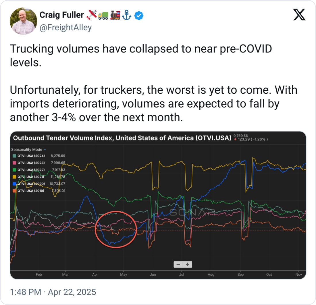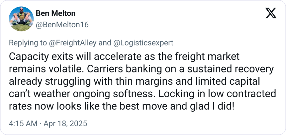 Demand is still down across most modes, but strategic pull-forwards ahead of tariffs caused temporary spikes, especially in flatbed. Carriers and shippers are playing a game of wait-and-see, with China-origin freight taking the hardest hit.