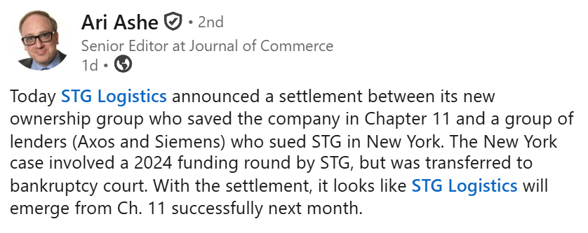 🏗️ STG Is Almost Out. STG Logistics has reached a settlement with minority lenders and plans to exit bankruptcy protection soon. The recapitalization plan gives Fortress Investment Group and Invesco majority ownership in exchange for a $1 billion debt reduction, over 90% of outstanding debt, and up to $150 million in fresh capital. The company also slashed its logistics division's third-party carrier pool by 30% in Q1, a move that signals it's doing more than just refinancing; it's rebuilding how it operates. Confirmation hearing is set for May 18. For brokers who move intermodal and drayage freight, STG coming out of bankruptcy as a leaner, better-capitalized platform matters: they'll be back competing for your lanes.