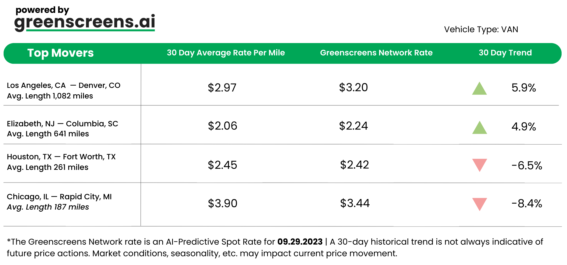 *Greenscreens.ai forecasts real-time truckload buy prices that are suited to each freight brokerage's purchasing power using AI and machine learning. Its engine takes into account over 130 attributes and data points in each rate forecast.