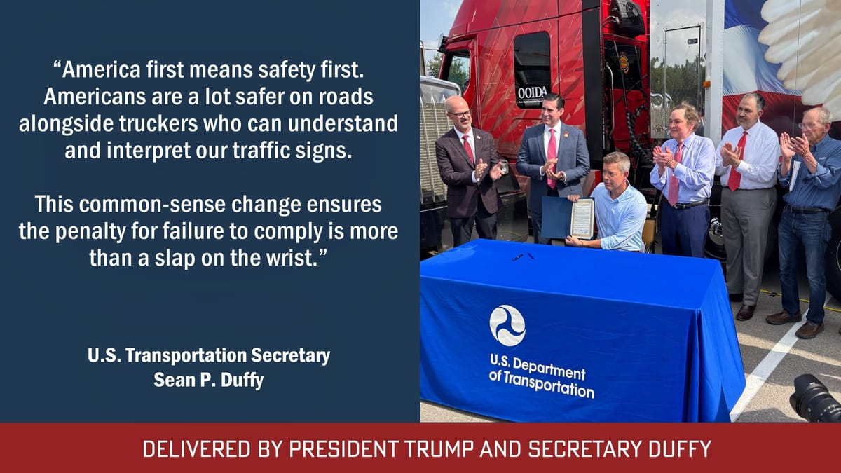 "If you listen to President Trump, it's America first. I want to put our American truck drivers first, and that means we look at what's happening with the non-domicile CDLs." ā DOT Secretary Sean Duffy