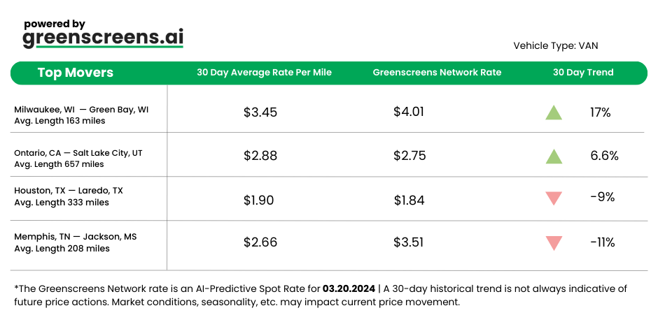 *Greenscreens.ai, forecasts real-time truckload buy prices that are suited to each freight brokerage's purchasing power using AI and machine learning. Its engine takes into account over 130 attributes and data points in each rate forecast.