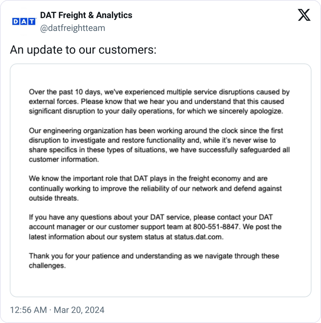 🫤 DAT Apologizes. DAT apologized for their service disruptions caused by "external factors".