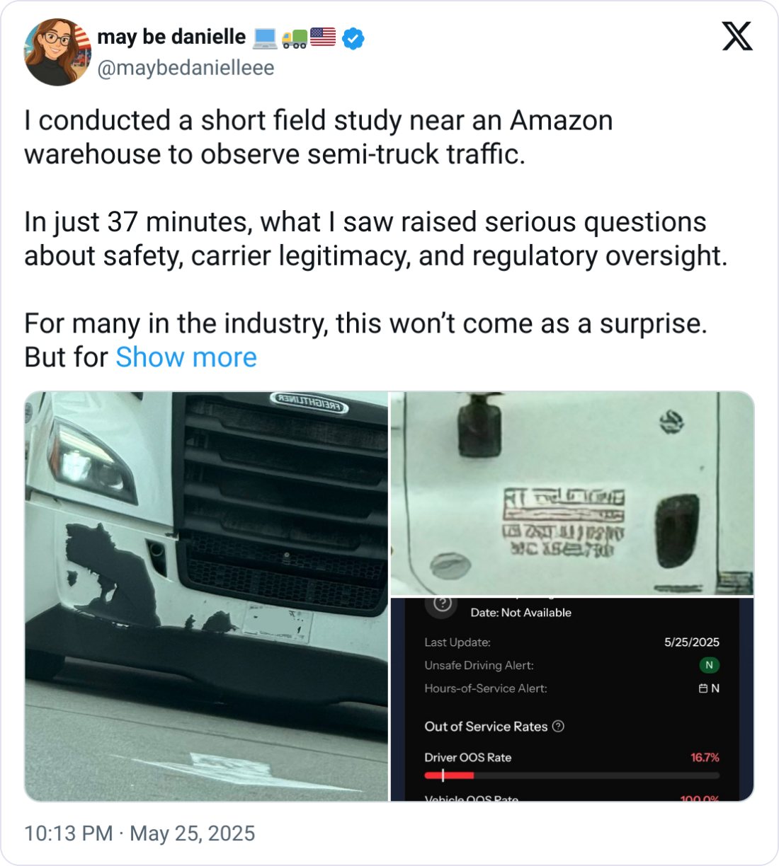 ā ļø Amazon Warehouse Study. Spending 37 minutes outside an Amazon warehouse, @maybedanielleee uncovered recycled DOTs, fake company names, and shockingly high out-of-service rates. Raising serious questions about safety and oversight at Amazon. Read the full thread here.