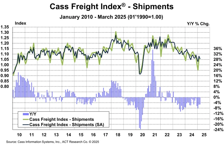 š Cass Freight Index Reveals Uneven March Trends. The Cass Freight Index reported mixed results for March, reflecting flat month-to-month shipment volume and a 3.5% year-over-year decline. Seasonally adjusted, shipments dropped 2.1% from February and 8.7% over two years. Despite a 2.8% monthly rise, freight expenditures fell 2.0% annually, tied to lower volumes and a 3.5% rise in inferred rates. Tim Denoyer, ACT Research Vice President and Senior Analyst, expects short-term volume boosts from pre-tariff activity, though ongoing trade tensions and tariff impacts may prolong the āfor-hire freight recession.ā Denoyer attributed the yearly decrease to reduced shipment volumesāevident in the 3.5% drop in annual shipmentsāas well as a 3.5% annual rise in inferred rates in March.