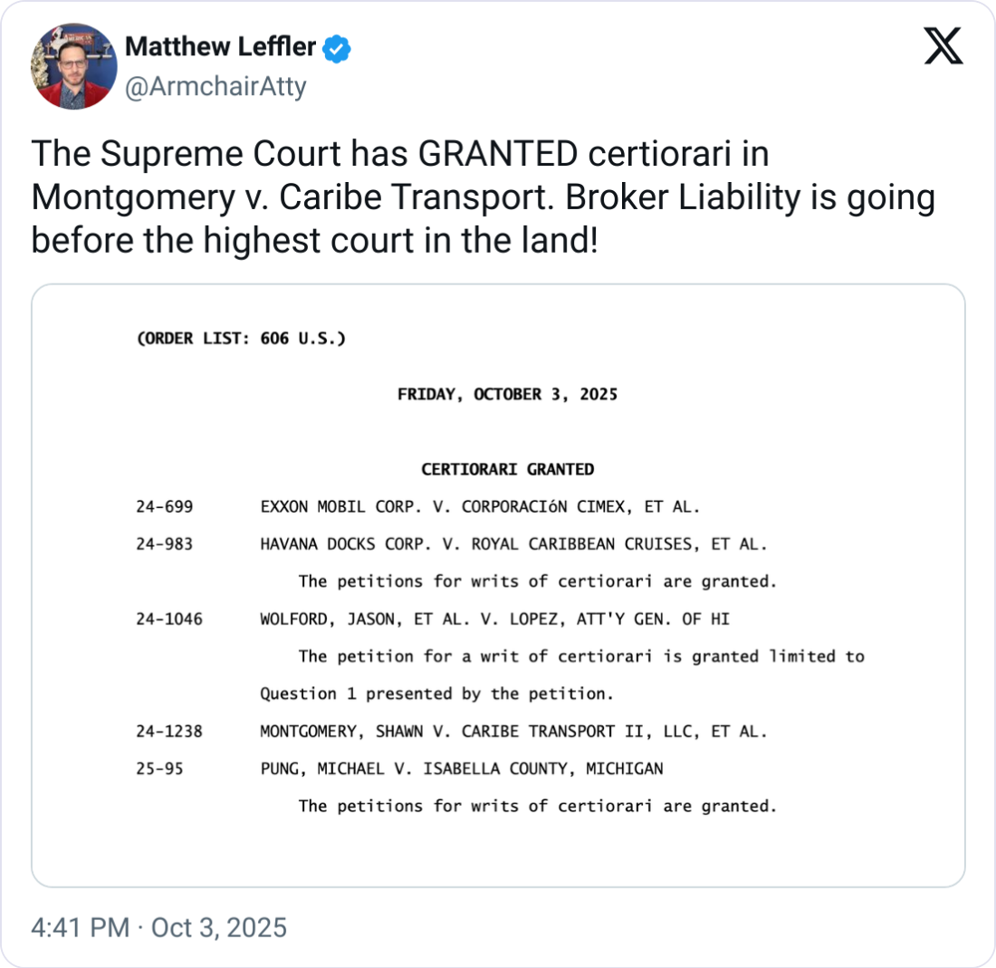 At the center of the storm is Montgomery v. Caribe Transport II, a broker liability case now actively moving through the U.S. Supreme Court docket (Caribe Transport was hired through C.H. Robinson to transport the load).