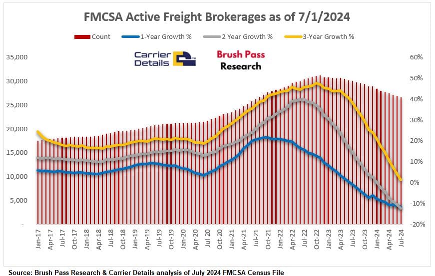 📉 Brokerage Decline. There are 288 fewer brokerages operating now compared to a year ago. The number of active freight brokerages has decreased by 11.6% year-over-year.