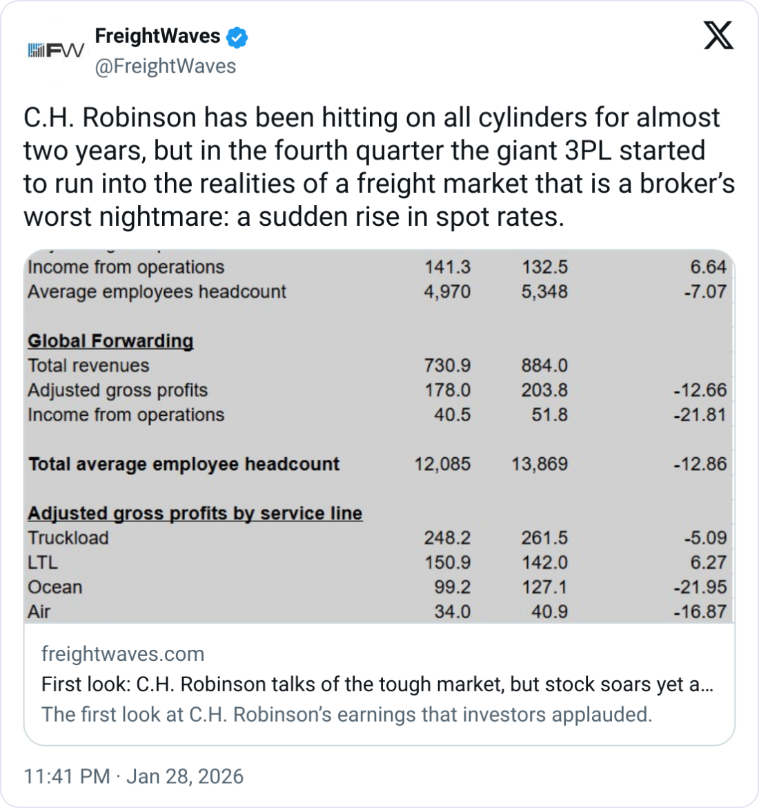 C.H. Robinson reported another quarter of outperformance in Q4 2025, according to information shared with FreightCaviar via email.