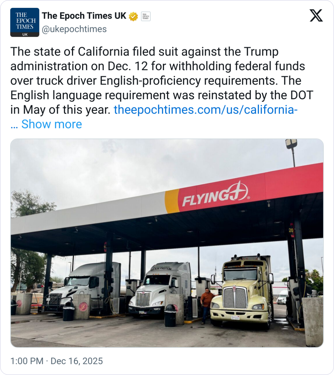 Happy Hump Day. California is now suing the DOT in a bid to reclaim withheld funding as CDL enforcement and English-proficiency rules tighten nationwide.